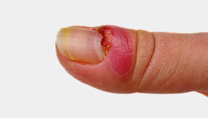 Нажмите, чтобы посмотреть. Панариций обычно выглядит как болезненный нарыв на пальце.