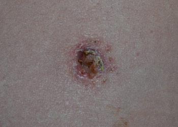 - Простая форма. Пупок краснеет, в углублении образуются гной и серозная жидкость, которые при высыхании образуют корочку, под которой накапливается гной. При отсутствии лечения возникают сыпь и грибовидные образования вокруг пупка.