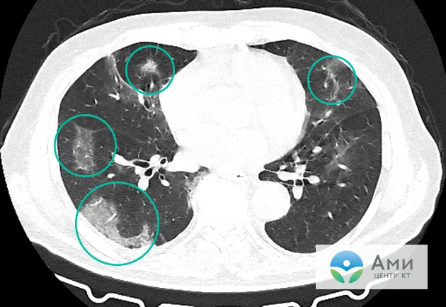 Повреждение легких на КТ при EVALI выглядит как пневмония. Оно определяется по симптомам «матового стекла» (очаги инфильтрации и уплотнения легочной ткани), локализованным в основном вокруг бронхов. Часто наблюдаются консолидация и затемнение. Чаще всего страдают нижнедолевые и субплевральные области легких — симметрично с обеих сторон.