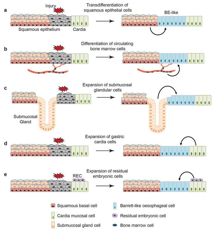 Рис. 2. Гипотезы возникновения пищевода Барретта, предложенные ранее. a – передифференцировка плоского эпителия пищевода; b – дифференцировка циркулирующих в крови стволовых клеток костного мозга; c – экспансия клеток слизистых желез пищевода и их превращение в эпителий Барретта; d – превращение стволовых клеток слизистых желез; e – экспансия и дифференцировка спящих остаточных эмбриональных клеток пограничной области пищевода/желудка. Рисунок из обсуждаемой статьи в Nature