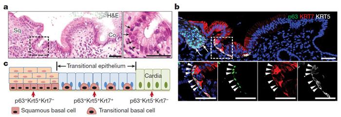 Ширина изучаемого участка составила 50 мкм. b – базальные клетки пограничного эпителия демонстрируют экспрессию генов p63, KRT5 и KRT7 (отрезки экспрессии выделены треугольниками). В базальных клетках плоского эпителия пищевода KRT7 не имеется (показано стрелками). Исследование проводилось с применением различных флюоресцентных красителей. Ширина изучаемого участка составила 50 мкм. c – схема строения эпителия в пограничной области между пищеводом и желудком человека, с обозначениями, аналогичными рис. 4. Схема из статьи в Nature.