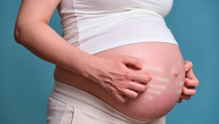 У женщин в период беременности зуд в области живота может быть спровоцирован растяжением кожи и гормональными изменениями.