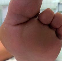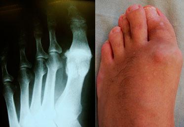 | Деформация первого пальца на ноге в виде вальгуса и молоткообразная форма второго пальца | Деформация первого пальца на ноге в виде вальгуса и молоткообразная форма второго, третьего и четвертого пальцев |